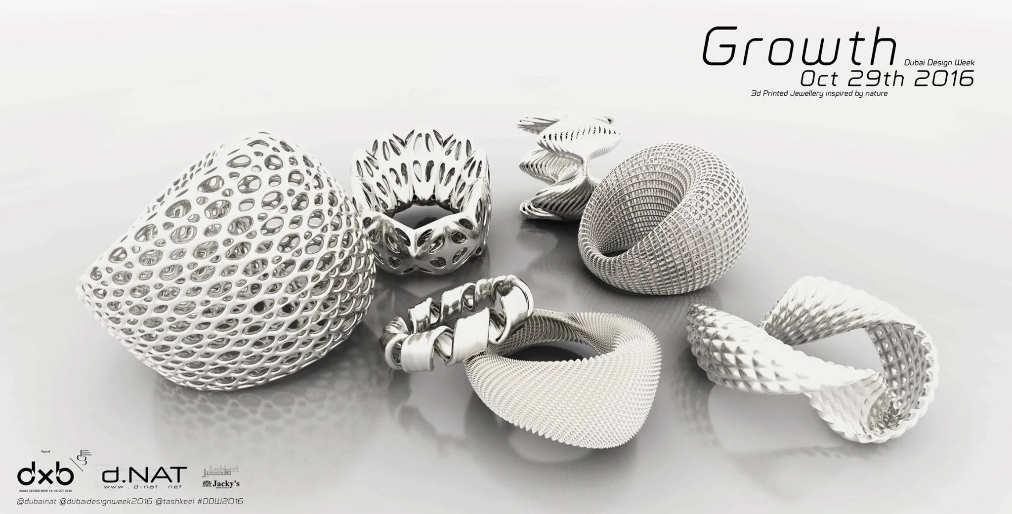 As part of Dubai Design Week, Growth is an introductory 3d printing event that aims to introduce people to the possibilities offered by the 3d-printing technology. The process integrates personal data taken from each participant, such as their date of birth or an anniversary, and translate it into a 3d printing piece in the form of a jewellery. The printed pieces are inspired by algorithmic structure taken from growth systems as found in nature to produce unique design artefacts. They exhibit a variety of natural forms and patterns while each relates to the personal data as fed by the participants.