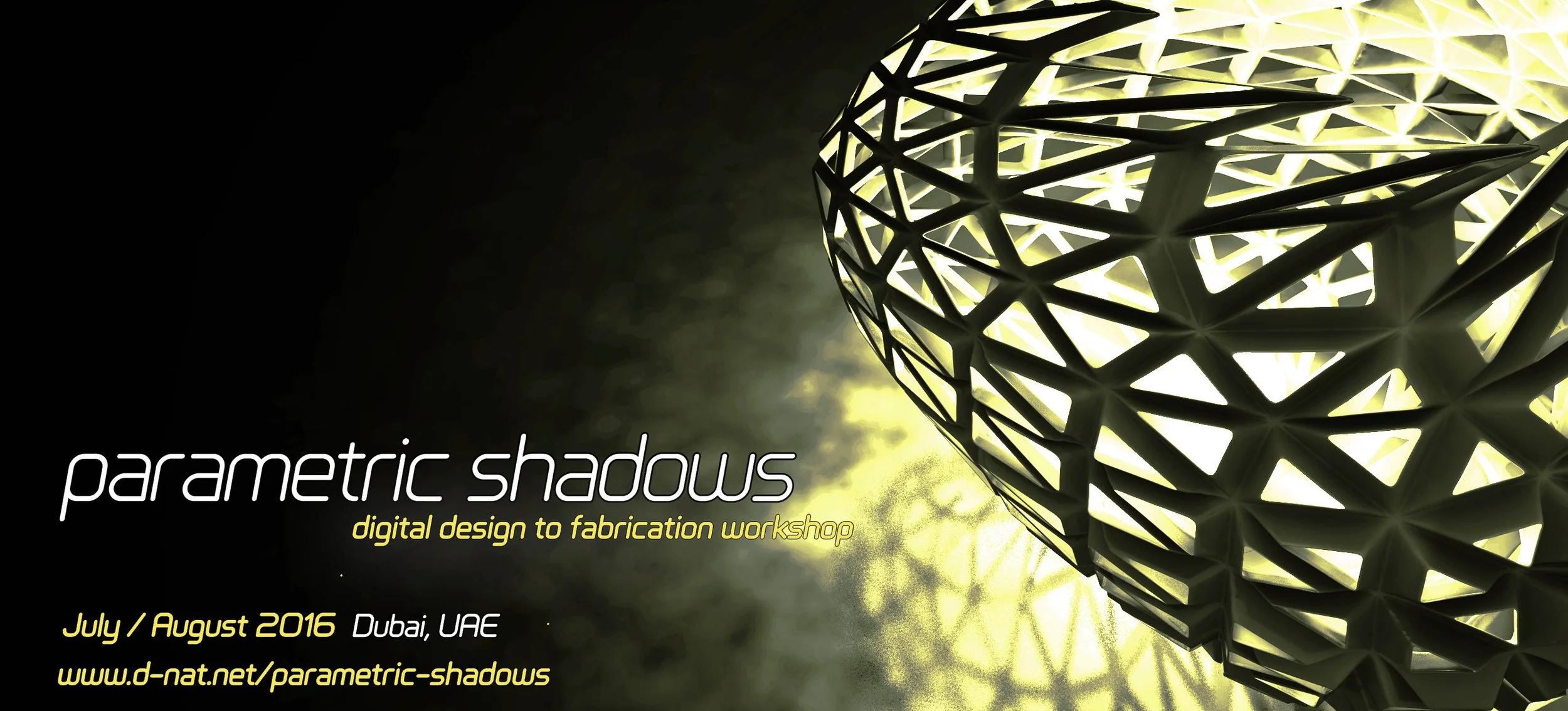Parametric shadows is a design to fabrication workshop which employs parametric design techniques to design and fabricate a lamp shed. The 4-day workshop- which runs over two weekends - has been designed for participants with no previous experience in Grasshopper or parametric design techniques. The workshop program will introduce them to both the theoretical and technical knowledge required to explore possibilities of the new design medium, then to apply the learning techniques to design and fabricate a parametric skin that will be adopted as a lamp shed, produced with a laser cutter or a 3d printer. The workshop aims is to teach students principles of parametric design and the process of taking their design out of the computer and into realisation.
